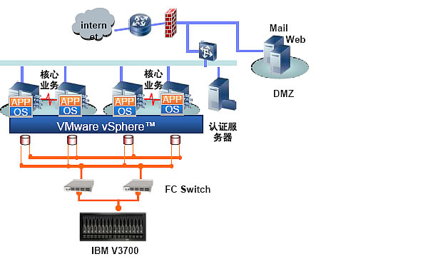 - IBM V3700在VMWare虚拟环境下的存储解决方案包括iSCSI,FC,10Gb/s,万兆FCoE等所有VMWare支持的存储接口